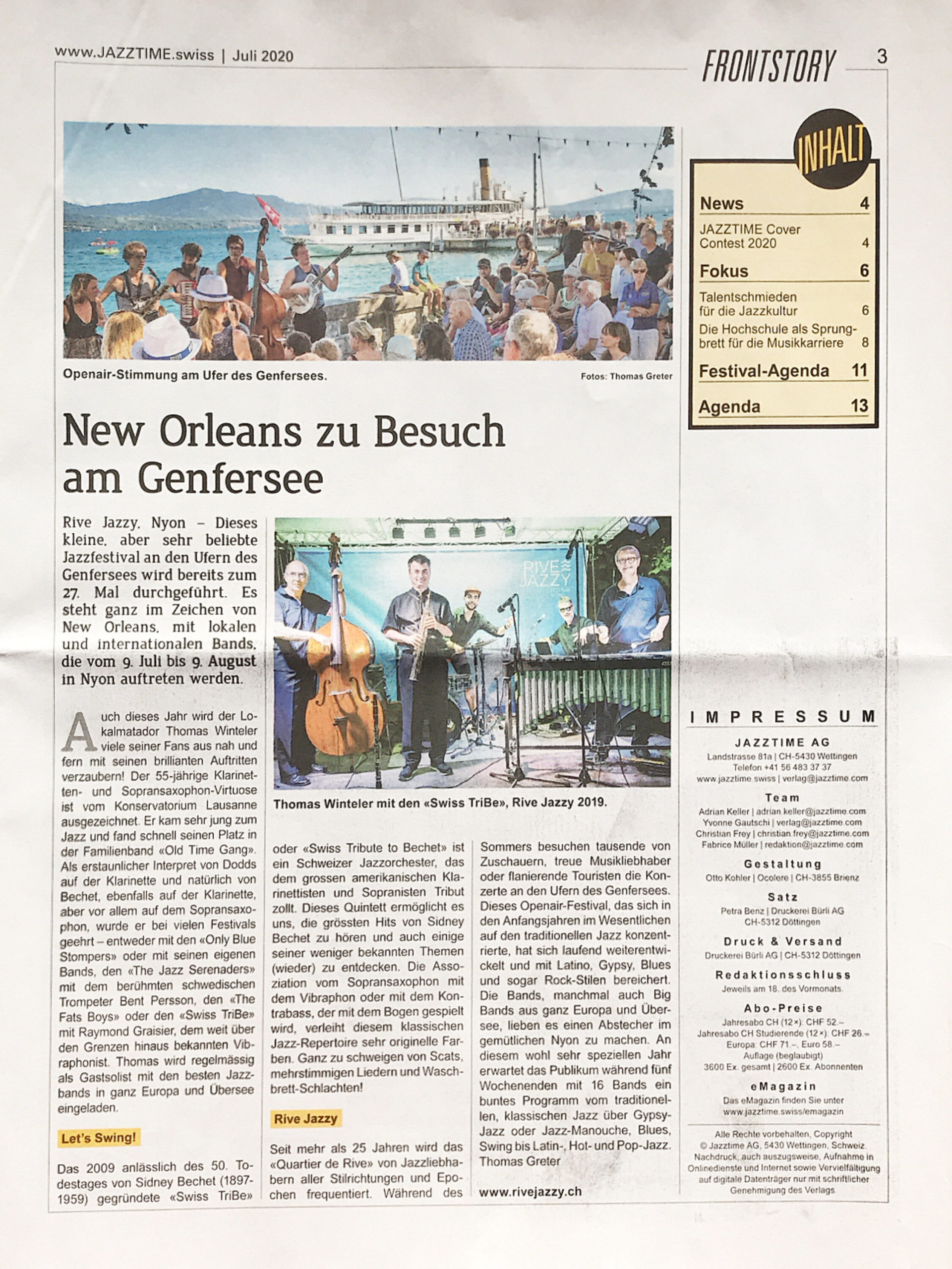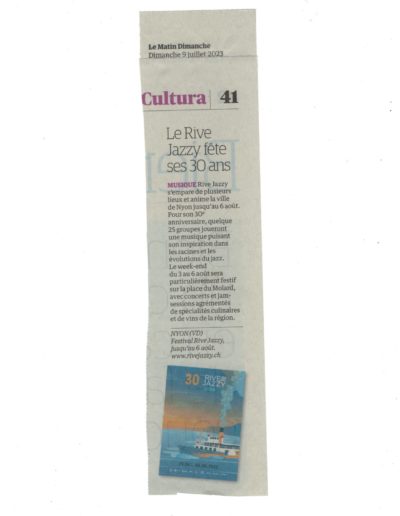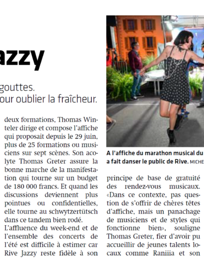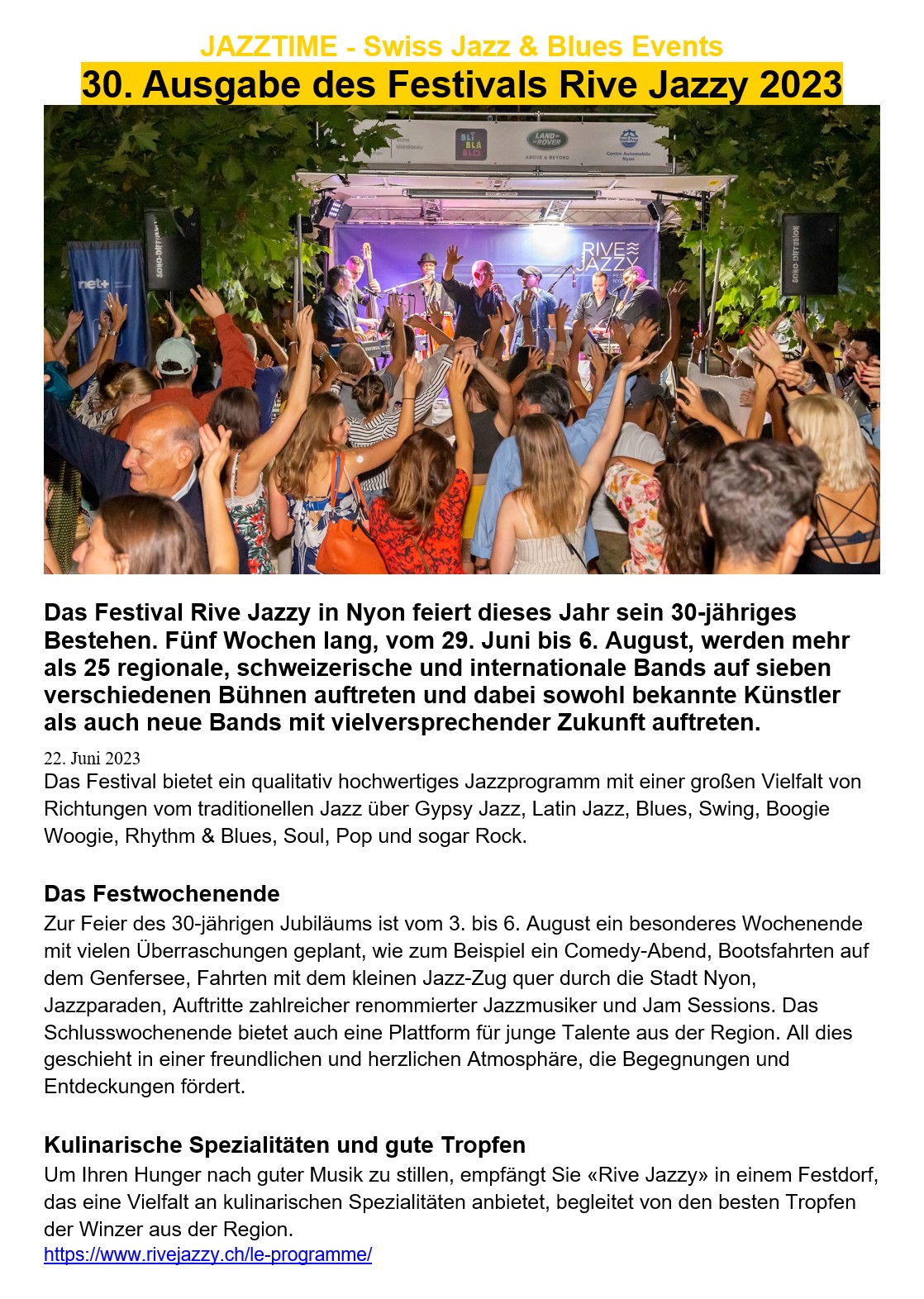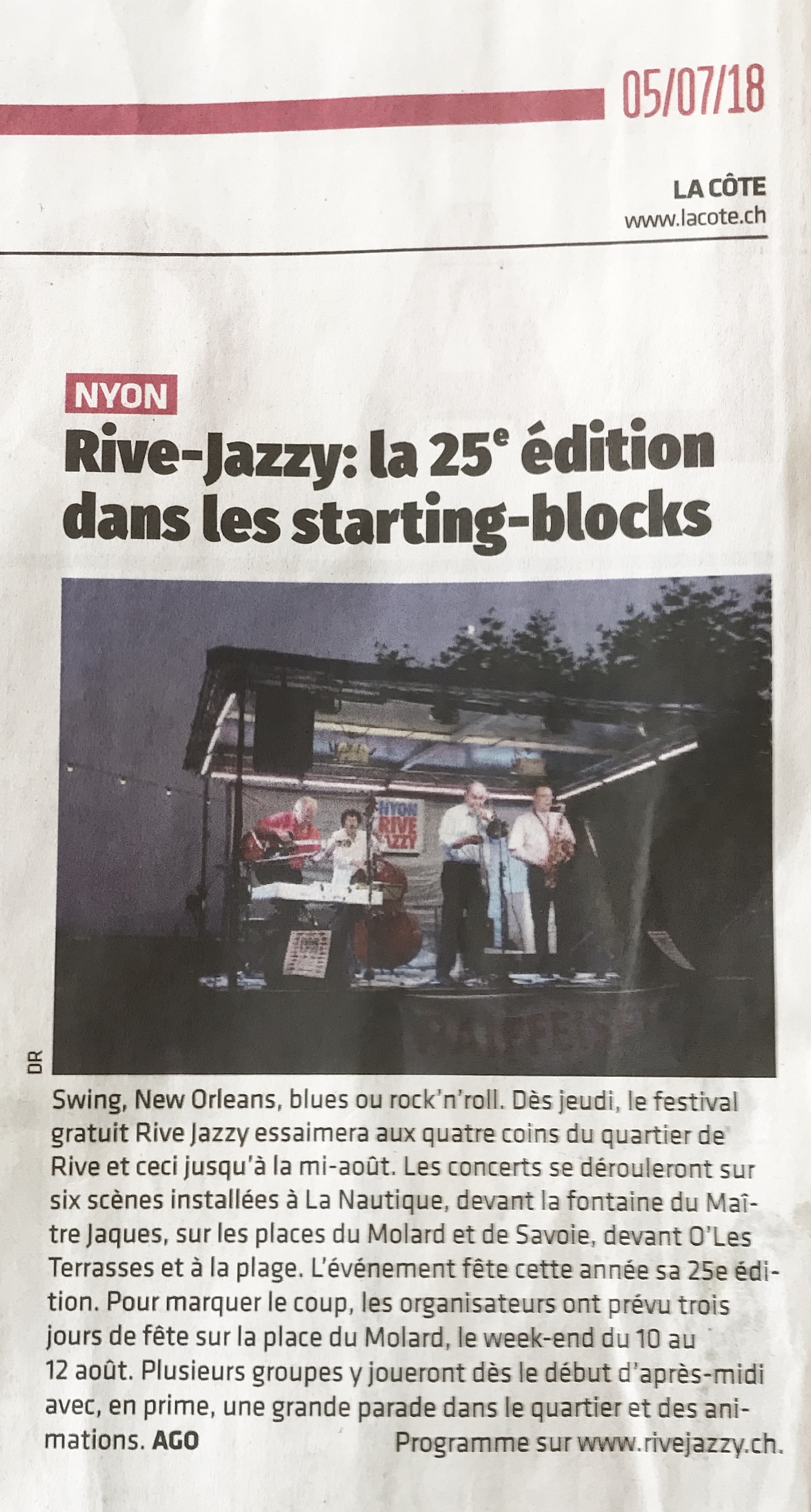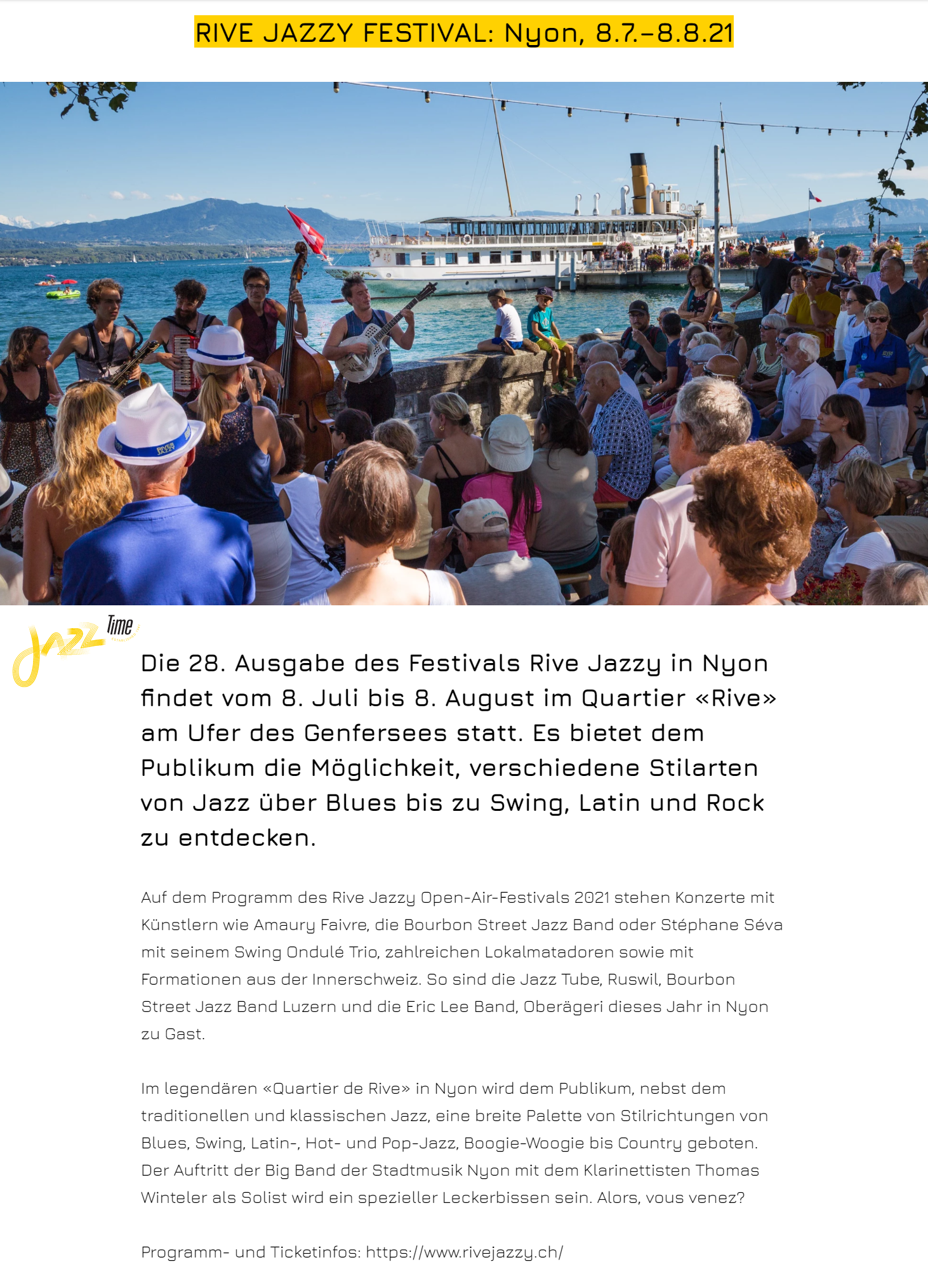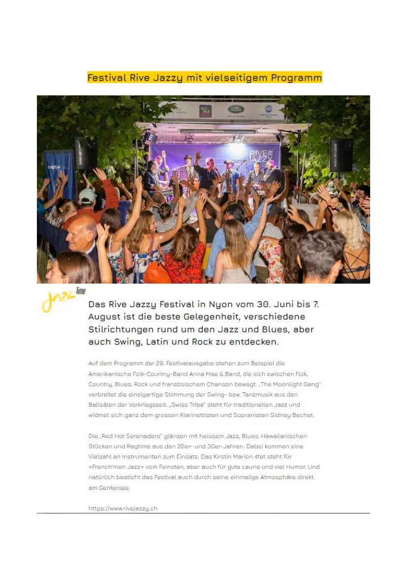 Pour tout interview ou renseignement sur le festival, veuillez vous adresser à Thomas Winteler, directeur du festival par téléphone (+41 76 374 81 63) ou email (info@rivejazzy.ch).